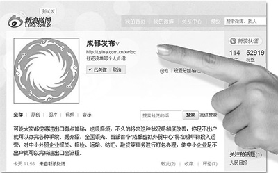 成都市政府新聞辦立足于拓展新聞發(fā)布傳播渠道的工作需要,針對(duì)微博這種新型傳播形式飛速發(fā)展的現(xiàn)狀,今年6月23日開通了命名為“成都發(fā)布”的官方微博,經(jīng)過半年多的運(yùn)營(yíng),截至12月23日,“成都發(fā)布”的“粉絲”(點(diǎn)擊瀏覽的注冊(cè)網(wǎng)友)人數(shù)已近5.3萬人。