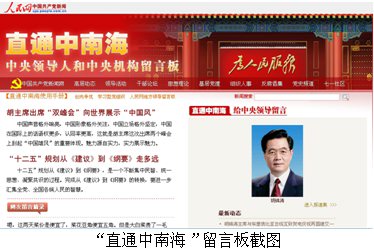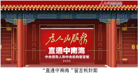 “直通中南海——中央領(lǐng)導(dǎo)人和中央機(jī)構(gòu)留言板”以“中南海新華門(mén)”和“為人民服務(wù)”影壁動(dòng)畫(huà)頁(yè)面為封面,網(wǎng)友點(diǎn)擊進(jìn)入留言板首頁(yè)就可以給中央領(lǐng)導(dǎo)人和中央機(jī)構(gòu)留言。留言板右側(cè)是中央政治局9位常委的照片,照片下有領(lǐng)導(dǎo)人的最新動(dòng)態(tài)新聞和“點(diǎn)擊留言”按鈕。網(wǎng)友留言可以個(gè)人的“網(wǎng)友”身份,也可以“黨組織”或單位名義。此外在中央政治局委員及書(shū)記處書(shū)記的名字一側(cè)也有留言按鈕,網(wǎng)友點(diǎn)擊即可進(jìn)入留言頁(yè)面。在同一個(gè)頁(yè)面,網(wǎng)友還可以給各中央機(jī)構(gòu)留言,包括中紀(jì)委、組織部、宣傳部、政法委等機(jī)構(gòu)在內(nèi),網(wǎng)友均可以點(diǎn)擊進(jìn)入。