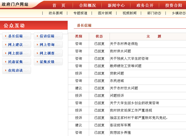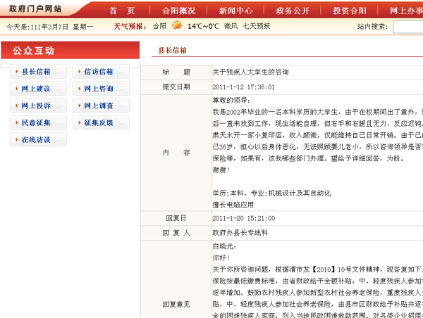 這是合陽縣政府網(wǎng)站“縣長(zhǎng)信箱”內(nèi)的一條留言與回復(fù)(網(wǎng)絡(luò)截圖)。陜西一個(gè)原本不起眼的小縣城合陽目前已成為網(wǎng)上網(wǎng)下熱點(diǎn),這個(gè)縣的政府網(wǎng)站由于對(duì)網(wǎng)民的咨詢和投訴件件有回復(fù),被網(wǎng)民稱作“最敬業(yè)的縣政府網(wǎng)站”。由于去“圍觀”頂起的網(wǎng)民太多,一度導(dǎo)致這個(gè)縣政府網(wǎng)站“癱瘓”?!白罹礃I(yè)的縣政府網(wǎng)站”為何被頂起?一直在關(guān)注兩會(huì)進(jìn)程的網(wǎng)民說:因?yàn)樗鹬鼐W(wǎng)民意見,不擺空架子不作秀,事事有回應(yīng)。參加兩會(huì)的不少代表委員也指出,合陽縣的經(jīng)驗(yàn)表明,網(wǎng)絡(luò)問政必須由原來的網(wǎng)民單向表達(dá)變成政府與網(wǎng)民的雙向互動(dòng),“網(wǎng)民有所呼,政府有所應(yīng)”才能見到實(shí)效,才能得到群眾的擁護(hù)。