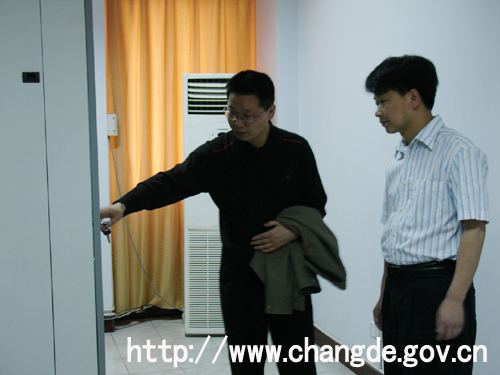 縣信息化辦負(fù)責(zé)人余立斌向黃貴生(右)介紹網(wǎng)站機房建設(shè)情況