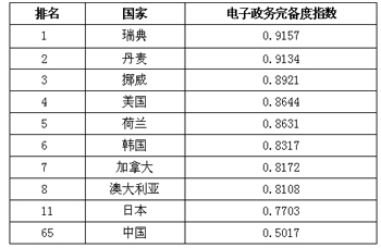 表1:2008年全球電子政府完備度主要國(guó)家排名