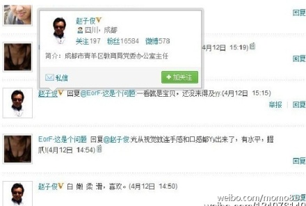 4月11日,名為“EorF-這是個問題”的博友在微博中曬了一張“波濤洶涌”的圖片,自稱“紀(jì)念粉絲破200,上新”,4月12日14:50分,加V認(rèn)證為“成都青羊區(qū)教育局黨委辦公室主任”的“趙子俊”對此發(fā)表評論:“白、嫩、柔滑,喜歡”。隨后“EorF-這是個問題”答道:“光從視覺就連手感和口感都yy出來了,有水平,握爪”,“趙子俊”立刻回到:“一看就是寶貝,還沒來得及yy。”幾分鐘后,“EorF-這是個問題”提醒對方:“加v的官勃呀,表亂看哦”