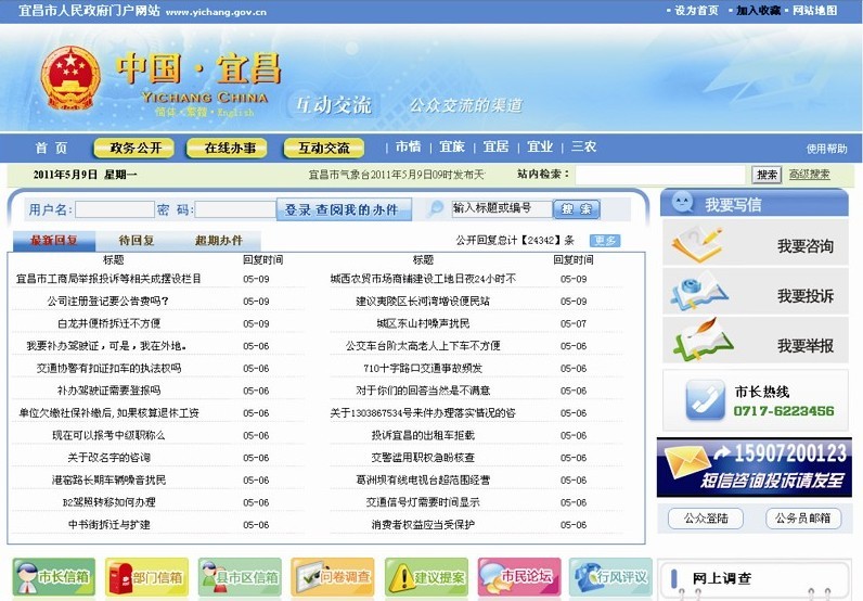 上什么網(wǎng)站?中國·宜昌門戶網(wǎng)站(www.yichang.gov.cn)是宜昌市人民政府對外的窗口,為廣大市民提供了信息公開、在線辦事、互動交流等多方面的服務(wù)。“政務(wù)公開”頻道是市政府及其各部門政府信息公開的第一平臺,共有66個單位和部門通過該平臺及時公開政府信息,主動公開的政府信息主要有機構(gòu)職能、規(guī)章文件、規(guī)劃計劃、應(yīng)急信息、人事信息、機關(guān)建設(shè)信息、各類工作信息和各類辦事信息等,到目前已經(jīng)主動公開3萬余條信息;同時市民還可以通過“依申請公開”方式獲取其他非主動公開信息。“在線辦事”頻道梳理了近300項市民26類和企業(yè)24類需要找政府辦理的事項,每個事項包含了辦事規(guī)程、所辦事項狀態(tài)查詢,設(shè)置了咨詢和投訴,部分事項可以在線申請辦理。“互動交流”頻道是政府聽民聲、了民意、解民難的重要渠道,市民有訴求、有咨詢、有投訴都可以通過中國·宜昌門戶網(wǎng)站“互動交流”頻道來注冊、提交、查詢;市直上線單位和部門有80多個,可以在線接受市民各類訴求、咨詢和投訴,到目前通過該頻道辦理市民各類來信超過10萬件,部門回復(fù)率、辦結(jié)率超過80%,市民滿意率超過85%.