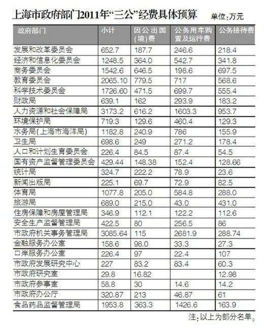 從市政府各部門公布的“三公”經(jīng)費(fèi)預(yù)算的情況來看,僅2011年上海市人民政府研究室“三公”經(jīng)費(fèi)預(yù)算“公務(wù)用車購置及運(yùn)行費(fèi)”一項并未有經(jīng)費(fèi)的支出預(yù)算。2011年7月28日召開的市十三屆人大常委會二十八次會議上,市財政局局長蔣卓慶受市政府委托,作了《關(guān)于上海市2010年市本級決算及2011年上半年預(yù)算執(zhí)行情況的報告》。經(jīng)市財政局匯總,2011年本市市級行政單位、事業(yè)單位和其他的單位用財政撥款開支的“三公”經(jīng)費(fèi)預(yù)算,合計11.1億元,其中,因公出國(境)經(jīng)費(fèi)預(yù)算1.95億元、公務(wù)用車購置及運(yùn)行費(fèi)預(yù)算5.85億元、公務(wù)接待費(fèi)預(yù)算3.3億元。有關(guān)本市市級部門“三公”經(jīng)費(fèi)預(yù)算向社會公開工作參照中央做法辦理。蔣卓慶說,下一階段,本市各級財政部門將加強(qiáng)財政預(yù)算和決算管理,深化細(xì)化財政信息公開。