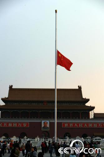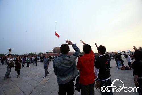 央視網(wǎng)消息:2008年5月19日凌晨4時57分40秒,北京天安門廣場下半旗,沉痛哀悼在汶川特大地震中的遇難者。為表達全國各族人民對四川汶川大地震遇難同胞的深切哀悼,國務院決定,2008年5月19日至21日為全國哀悼日。