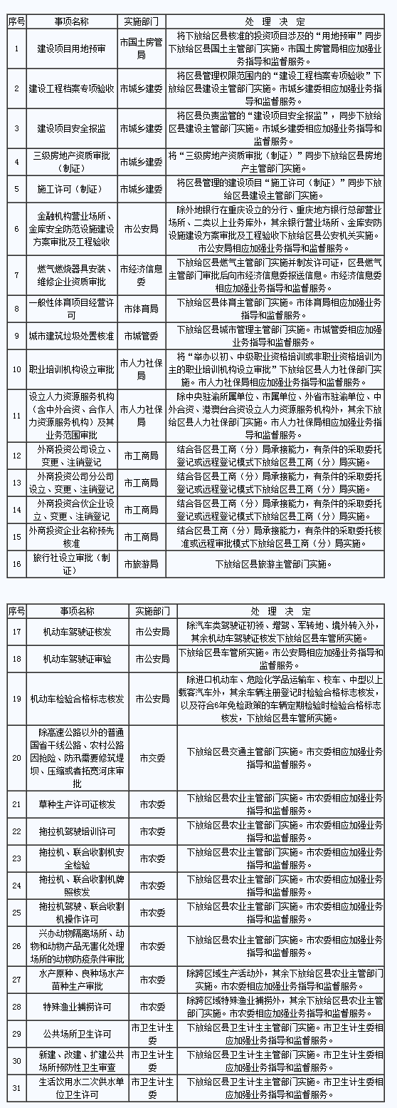 市民辦理“機(jī)動(dòng)車駕駛證核發(fā)”、“公共場(chǎng)所衛(wèi)生許可”等事項(xiàng),今后將更加方便。近日,記者從市政府網(wǎng)獲悉,為進(jìn)一步深化行政審批制度改革,推動(dòng)關(guān)聯(lián)、相近的行政審批等管理事項(xiàng)“全鏈條”下放給區(qū)縣(自治縣)實(shí)施,增強(qiáng)下放行政審批等管理事項(xiàng)的協(xié)同性、聯(lián)動(dòng)性,日前,市政府發(fā)布《重慶市人民政府關(guān)于協(xié)同配套下放一批市級(jí)行政審批等管理事項(xiàng)的決定》,決定下放31項(xiàng)市級(jí)行政審批等管理事項(xiàng)。