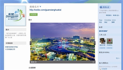 2011年,東莞市政府新聞辦和市公安局率先開通了官方微博“莞香花開”和“平安東莞”。隨后市第一人民法院、市旅游局、市教育局、長安鎮(zhèn)、橫瀝鎮(zhèn)等十多個(gè)職能部門和鎮(zhèn)街也相繼開通了官方微博。