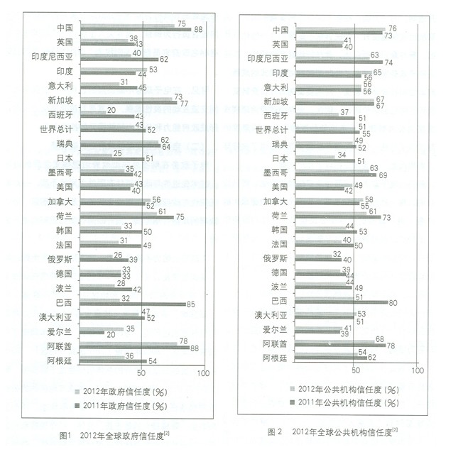美國愛德曼公關(guān)公司2012年的全球政府信任調(diào)查顯在被調(diào)查的25個(gè)國家和地區(qū)中,只有阿聯(lián)酋、中國、新加坡、瑞典、荷蘭、加拿大等6個(gè)國家公眾對政府的信任度超過50%。與2011年相比(2011年調(diào)查了23個(gè)國家和地區(qū),2012年調(diào)查了25個(gè)國家和地區(qū)),23個(gè)國家和地區(qū)的公眾對政府的總體信任度呈下降態(tài)勢,降幅為9個(gè)百分點(diǎn),具體而言,有4個(gè)國家和地區(qū)的的公眾對政府的信任度呈上升態(tài)勢、1個(gè)呈持平狀態(tài)、18個(gè)呈下降態(tài)勢,降幅最大的是巴西。另外,23個(gè)國家和地區(qū)的公眾對公共機(jī)構(gòu)的總體信任度也呈下降態(tài)勢,降幅為4個(gè)百分點(diǎn),具體而言,有7個(gè)呈上升態(tài)勢,2個(gè)呈持平狀態(tài),15個(gè)呈下降態(tài)勢(參見圖1、圖2)。