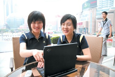 圖為游客在徐家匯港匯廣場利用筆記本無線上網(wǎng)查附近商家信息。