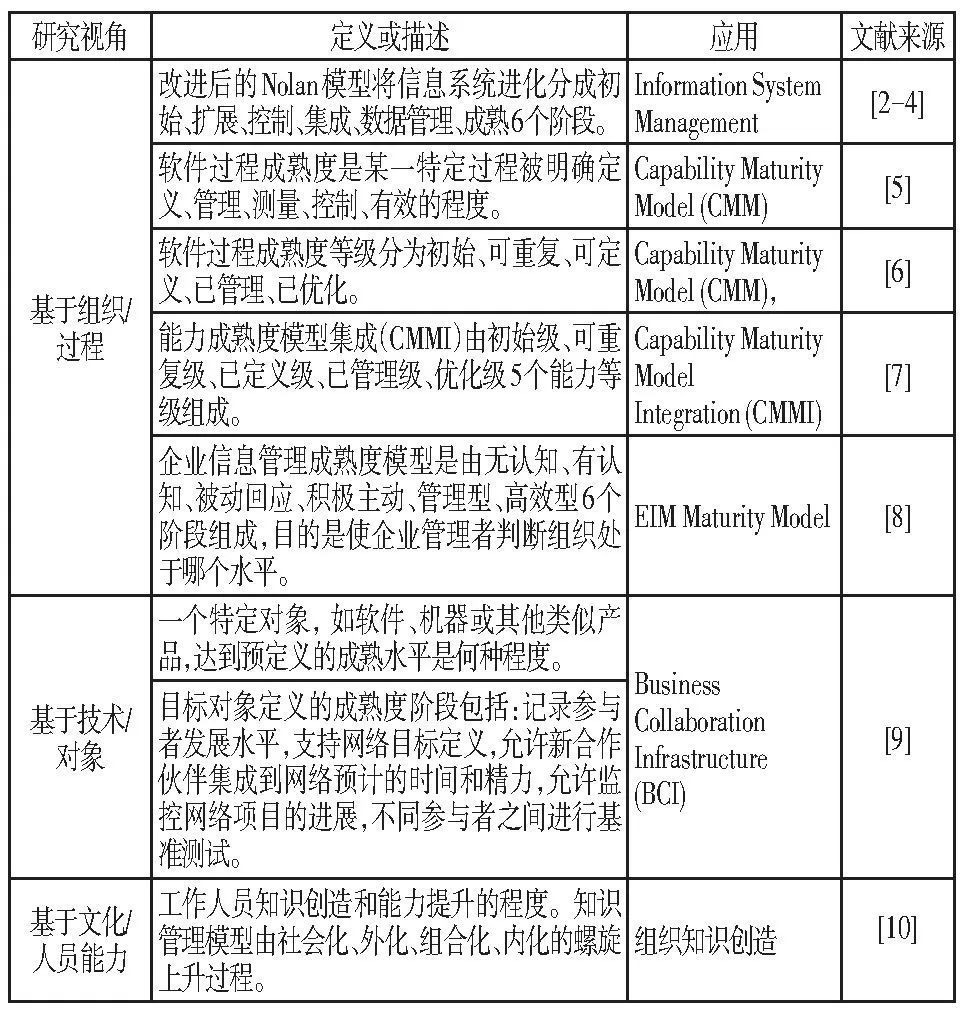 成熟度通常指特定能力從最初到期望達(dá)到目標(biāo)的過程中的演化進(jìn)度。成熟度模型是一種對(duì)關(guān)注領(lǐng)域進(jìn)行評(píng)估的工具和持續(xù)改進(jìn)的方法, 用于把成熟度要素分成若干不同階段, 評(píng)估領(lǐng)域現(xiàn)狀和所處發(fā)展階段。目前成熟度模型主要分為組織、技術(shù)、文化三類視角, 現(xiàn)將不同領(lǐng)域視角下的成熟度模型定義、描述與應(yīng)用進(jìn)行簡單梳理, 如表1所示。