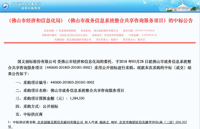 2018年4月10日,北京國脈互聯(lián)信息顧問有限公司成功中標“佛山市政務信息系統(tǒng)整合共享咨詢服務項目”。