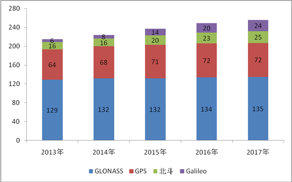 圖9 2013-2017年全球四大衛(wèi)星導航系統累計發(fā)射衛(wèi)星數