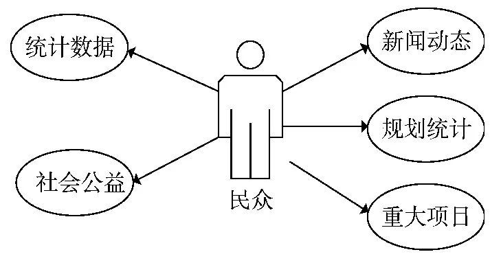 政務公開模塊是政府部門通過本平臺實施“問政于民”政策的一個窗口, 即有選擇性地將政府部門的一些日常政務信息向廣大民眾公開, 并接受民眾的監(jiān)督。參與政務公開的用戶主體為部門用戶和民眾。政務公開由新聞動態(tài)、規(guī)劃計劃、重大項目、社會公益、統(tǒng)計數(shù)據(jù)和人事信息等子欄目組成。這些政務信息都是由所在部門用戶負責編輯完成的。其用例圖如圖2所示。