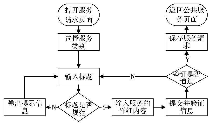 2、事務辦理。民眾在向政府部門提出事務辦理請求時, 其過程為:首先, 民眾用戶打開請求頁面, 選擇請求服務的類別, 然后輸入服務的標題, 系統(tǒng)驗證該標題是否符合規(guī)范, 如果不符合規(guī)范則彈出提示信息, 并讓用戶重新輸入, 如果符合規(guī)范則輸入服務的詳細內容, 最后提交給系統(tǒng)驗證, 如果驗證失敗將彈出驗證失敗的提示信息, 反之則保存服務請求, 并返回到公共服務管理頁面。其流程如圖6所示。