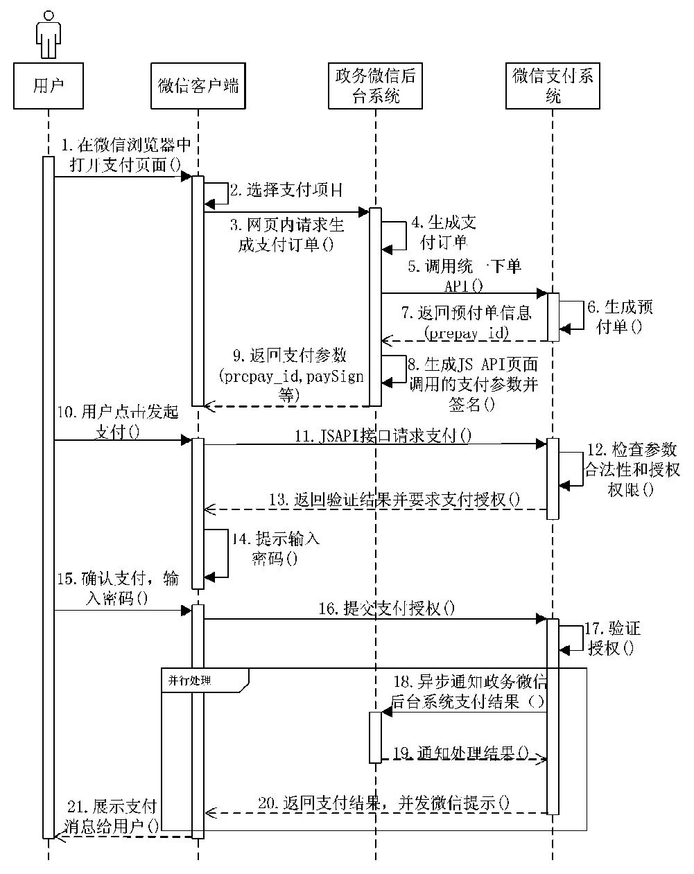 公眾提交個人信息后, 系統(tǒng)根據(jù)這些信息在數(shù)據(jù)庫中查詢待繳費事項、金額等信息, 系統(tǒng)將這些信息以及政務微信的應用表示App Id、用戶標識Open Id、簽名Sign等參數(shù)封裝成XML, 并將該XML發(fā)送給微信的統(tǒng)一下單地址, 得到prepay_id, pay Sign等支付參數(shù)。公眾選擇待繳事項后, 進入支付頁面。在支付頁面中, 輸入繳納金額后, 點擊支付, 發(fā)起支付請求。微信客戶端接收到支付請求后, 在頁面中調用JS API接口向微信支付系統(tǒng)請求支付, 并將得到的prepay_id, pay Sign等支付參數(shù)通過HTTPS協(xié)議傳輸給微信支付系統(tǒng)。微信支付系統(tǒng)驗證得到的支付參數(shù)的合法性和支付發(fā)起域名的權限。驗證通過后, 將驗證結果返回給微信客戶端, 并要求用戶給予支付授權。此時支付頁面上會要求用戶輸入支付密碼, 用戶確認支付并輸入支付密碼后, 微信支付系統(tǒng)驗證該授權并完成支付操作。政務微信后臺系統(tǒng)收到支付結果后, 將支付信息加密存儲在數(shù)據(jù)庫, 以便用戶可以查詢歷史支付記錄, 并且通知微信客戶端, 顯示支付成功頁面, 展示支付信息。繳納費用的時序如圖7所示。