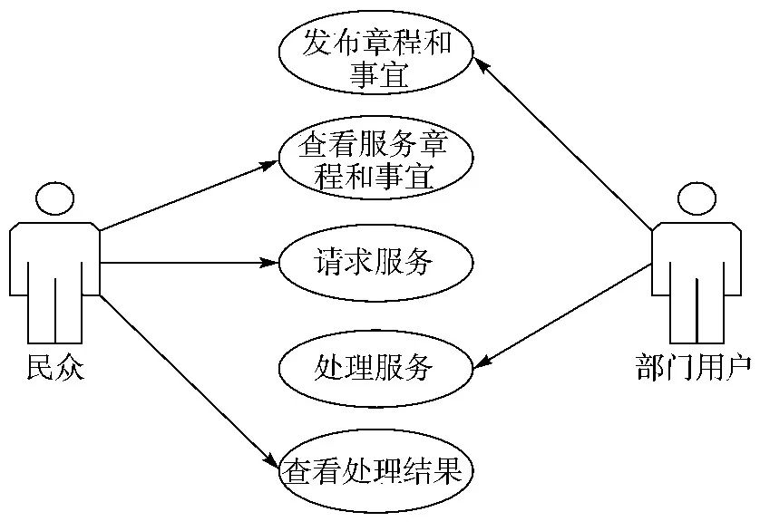 事務辦理是政府部門和廣大民眾的一個橋梁, 為廣大民眾提供了事務辦理流程查詢和辦理等功能, 更好地提升政府部門的公共服務能力。該模塊中主要包括5個子模塊, 即發(fā)布服務章程和事宜、查看服務章程和事宜、請求服務、辦理服務請求和查看辦理結果。其中, 由部門用戶負責完成的模塊是發(fā)布服務章程和辦理服務請求, 而民眾可以查看服務章程, 請求服務并查看請求的最終處理結果。其用例圖如圖3所示。