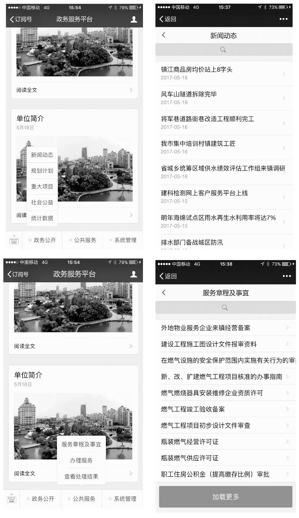 本平臺的后臺程序使用Java開發(fā), 保證平臺的穩(wěn)定性與可靠性。前臺頁面基于HTML5、CSS3、Java 以及Ajax技術進行設計和開發(fā)。在保證功能性的同時, 提升頁面的美觀程度, 并對用戶操作流程進行優(yōu)化, 保證本平臺的用戶友好性, 使本平臺簡潔、易使用。平臺的主界面為微信公眾號頁面, 通過設置微信公眾號的自定義菜單以及二級自定義菜單的跳轉鏈接, 來實現(xiàn)平臺的各個功能頁面。平臺的功能頁面主要有:新聞動態(tài)、重大項目、統(tǒng)計數(shù)據(jù)、事務辦理、繳納費用等。部分頁面如圖4所示。