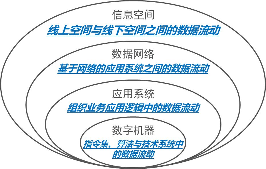 基于上述討論,本文將“數(shù)據(jù)流動(dòng)”劃分為四個(gè)層次:數(shù)字機(jī)器、應(yīng)用系統(tǒng)、數(shù)據(jù)網(wǎng)絡(luò)和信息空間。