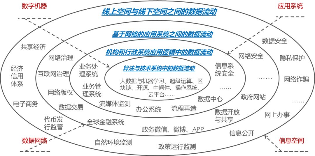 在數(shù)字機(jī)器層,雖然數(shù)據(jù)流動(dòng)的規(guī)則制定屬于技術(shù)專家的業(yè)務(wù)范圍,但是政府仍然保留在該層上對(duì)數(shù)據(jù)流動(dòng)的治理空間。由于該層面不涉及具體的應(yīng)用邏輯,政府職責(zé)在于提供技術(shù)標(biāo)準(zhǔn),即保證對(duì)該層面數(shù)據(jù)流動(dòng)的可控性。比如在政務(wù)信息化過(guò)程中保持對(duì)底層技術(shù)的關(guān)注,在安全要求較低的領(lǐng)域可以采用國(guó)際通行的技術(shù)標(biāo)準(zhǔn)以提高數(shù)據(jù)流動(dòng)效率,但是在某些實(shí)踐中政府并不希望處于底層的數(shù)據(jù)空間處于不可控狀態(tài),因而要求選擇本土化或開源的平臺(tái)技術(shù)。盡管大數(shù)據(jù)被視為數(shù)據(jù)與算法、網(wǎng)絡(luò)與存儲(chǔ),決策與管理相互交織融合的產(chǎn)物,然而與機(jī)器學(xué)習(xí)一樣,算法的精要性仍然是價(jià)值所在,其中蘊(yùn)含了對(duì)數(shù)據(jù)流的結(jié)構(gòu)化。政府正在積極研究區(qū)塊鏈技術(shù)的信用價(jià)值——一種可以為數(shù)據(jù)流動(dòng)提供可記錄、可跟蹤、可保密的分布式數(shù)據(jù)組織模式。云平臺(tái)、分布式和超級(jí)運(yùn)算為提高數(shù)據(jù)流動(dòng)效率提供基礎(chǔ)設(shè)施,使數(shù)據(jù)流動(dòng)可以更加充分地利用物理資源并尋找最佳的流動(dòng)路徑。在這個(gè)層面,指令與算法構(gòu)成了數(shù)據(jù)最基本的流動(dòng)結(jié)構(gòu)——有關(guān)結(jié)構(gòu)的結(jié)構(gòu)或稱之為數(shù)據(jù)的“元流動(dòng)”——也即給出了數(shù)據(jù)流動(dòng)的法則,何種資格的變量或設(shè)備在何種條件下可以獲得并處理數(shù)據(jù),標(biāo)準(zhǔn)化、效率、可控性是這里數(shù)據(jù)治理的關(guān)鍵。