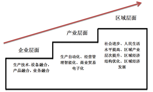 在企業(yè)層面,以信息技術(shù)與工業(yè)技術(shù)融合帶動(dòng)生產(chǎn)設(shè)備、人力資源、自然資源等發(fā)生變化,導(dǎo)致生產(chǎn)要素層面發(fā)生融合,促進(jìn)工業(yè)產(chǎn)品數(shù)字化、智能化、網(wǎng)絡(luò)化,催生業(yè)務(wù)流程融合、管理及經(jīng)營方式融合,以及最終產(chǎn)品的融合;在產(chǎn)業(yè)層面,發(fā)生在企業(yè)及行業(yè)中的生產(chǎn)要素、生產(chǎn)過程及產(chǎn)品的融合,導(dǎo)致產(chǎn)業(yè)的功能邊界被打破,促進(jìn)了產(chǎn)業(yè)層面的融合。主要體現(xiàn)為生產(chǎn)自動(dòng)化、經(jīng)營管理智能化、商業(yè)貿(mào)易電子化等;在區(qū)域?qū)用?,產(chǎn)業(yè)層面的融合促進(jìn)了新型產(chǎn)業(yè)的衍生,并影響到經(jīng)濟(jì)增長方式的相應(yīng)變化,從而使社會(huì)價(jià)值模式發(fā)生轉(zhuǎn)變,深入到生產(chǎn)實(shí)踐及現(xiàn)實(shí)生活的各個(gè)層面,促進(jìn)社會(huì)進(jìn)步和人民生活水平提高,以及區(qū)域經(jīng)濟(jì)的良好發(fā)展。