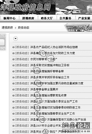 6月12日,一位名為“無(wú)襠牌人士”的網(wǎng)友在網(wǎng)易論壇上發(fā)了題為“史上最具有中國(guó)特色的官方網(wǎng)站新聞標(biāo)題”的帖子,并附上了相關(guān)網(wǎng)址(http://www.yangxian.gov.cn/DfwhItem.asp?ID=10099)。在該帖所附的網(wǎng)頁(yè)截圖中,滿目都是規(guī)律的數(shù)字。該帖子稱,這些標(biāo)題來(lái)自洋縣政府信息網(wǎng)的政務(wù)動(dòng)態(tài)部分,圖中出現(xiàn)的洋縣位于陜西省西南部,是著名的“朱鹮之鄉(xiāng)”。