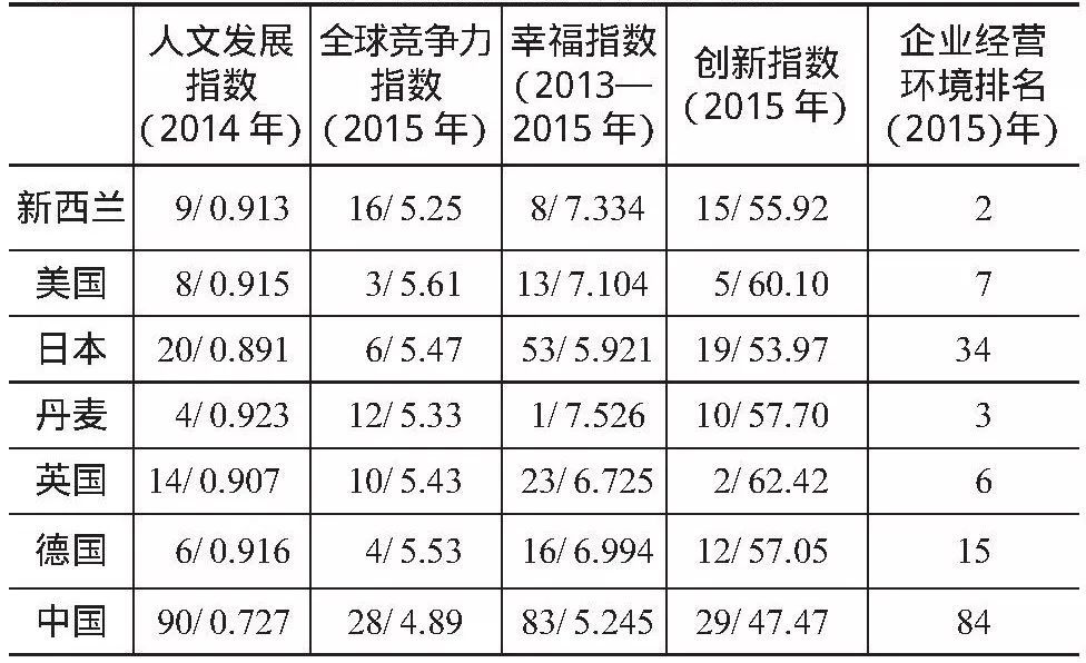 一個(gè)國家要真正走向現(xiàn)代化, 必須實(shí)現(xiàn)經(jīng)濟(jì)、社會(huì)、政治、民生等方面的協(xié)調(diào)現(xiàn)代化。因而, 一個(gè)國家各方面的經(jīng)濟(jì)社會(huì)發(fā)展指數(shù)之間必須相互均衡、相互匹配。在這些指數(shù)中, 人文發(fā)展指數(shù)、全球競(jìng)爭(zhēng)力指數(shù)、幸福指數(shù)、創(chuàng)新指標(biāo)和企業(yè)經(jīng)營(yíng)環(huán)境等五個(gè)重要指數(shù)之間必須均衡。如表2所示, 美國的各個(gè)重要發(fā)展指數(shù)之間基本均衡, 美國人文發(fā)展指數(shù)2014年為0.915, 排名第8位;全球競(jìng)爭(zhēng)力指數(shù)2015年為5.61, 排名第3位;幸福指數(shù)2013—2015年為7.104, 排名第13位, 創(chuàng)新指數(shù)2015年為60.10, 排名第5位, 企業(yè)經(jīng)營(yíng)環(huán)境排名第2位。而我國人文發(fā)展指數(shù)2014年為0.727, 排名第90位, 全球競(jìng)爭(zhēng)力指數(shù)2015年為4.89, 排名第28位;幸福指數(shù)2013—2015年為5.245, 排名第83位, 創(chuàng)新指數(shù)2015年為47.47, 排名第29位, 企業(yè)經(jīng)營(yíng)環(huán)境排名第84位138, 346-377。顯然, 我國人文發(fā)展指數(shù)、幸福指數(shù)、企業(yè)經(jīng)營(yíng)環(huán)境指數(shù)全球排名均在75位之后, 大幅度低于我國全球競(jìng)爭(zhēng)力指數(shù)、創(chuàng)新指數(shù)的全球排名。這既說明我國各經(jīng)濟(jì)社會(huì)發(fā)展指數(shù)之間的嚴(yán)重不均衡, 也說明我國進(jìn)一步深化放管服改革, 進(jìn)一步提升企業(yè)經(jīng)營(yíng)環(huán)境、幸福指數(shù)、人文發(fā)展指數(shù)的極端重要性。