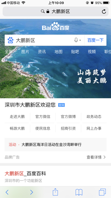 利用互聯(lián)網(wǎng)傳播優(yōu)勢,聚焦主題服務(wù),將政府網(wǎng)站“走進(jìn)大鵬、政務(wù)動態(tài)、便民信息、招商引資、網(wǎng)上辦事”等欄目納入百度“城市名片”,共設(shè)有9個專欄。建設(shè)品牌觸發(fā)機(jī)制,設(shè)置“大鵬新區(qū)+(關(guān)鍵詞)”政府品牌專區(qū)關(guān)鍵詞包,網(wǎng)頁首屏首位展現(xiàn)大鵬新區(qū)個性化設(shè)置品牌專區(qū),充分發(fā)揮政府網(wǎng)站在提升政府公信力、回應(yīng)社會關(guān)切、提供便捷服務(wù)、加強(qiáng)互動交流等方面的作用。