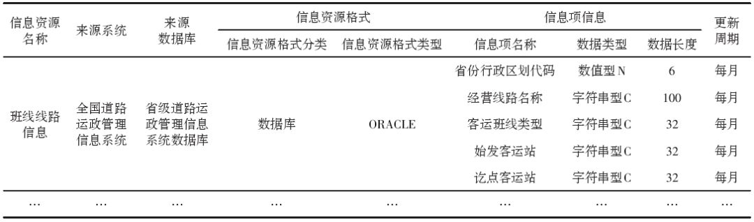 依托前期信息資源調(diào)研成果,編目人員可通過電子表格的形式直接進(jìn)行人工編目,或使用目錄系統(tǒng)進(jìn)行在線人工編目。此外,對于可直接訪問其業(yè)務(wù)數(shù)據(jù)庫的信息資源,可通過目錄系統(tǒng)從數(shù)據(jù)庫中提取元數(shù)據(jù)特征信息,從而實現(xiàn)自動編目。信息化部分編目,將完成對信息資源名稱、信息資源提供方、信息資源提供方代碼、來源系統(tǒng)、來源數(shù)據(jù)庫、信息資源格式、信息項屬性、更新周期等核心元數(shù)據(jù)的賦值,形成信息資源清單。以全國道路運政管理信息系統(tǒng)為例,形成的信息資源清單如表4所示。