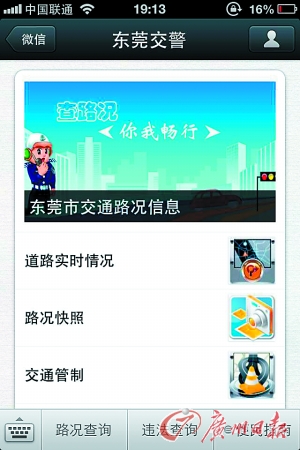 其中“東莞交警”功能最全。在微信上點開“東莞交警”的頁面,可以看到路況查詢、違法查詢等功能,還有交規(guī)學習、辦事指引、網(wǎng)點分布等便民指南,微信網(wǎng)友可以輕松方便地使用。同時網(wǎng)友們還可以回復“從××到××”或“××路況”定制路線查詢路況。此外,微信網(wǎng)友還可以與“東莞交警”互動,通過路況快照功能,自己拍照,發(fā)布路段信息。