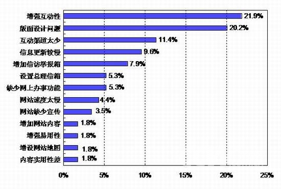 對(duì)網(wǎng)民體驗(yàn)評(píng)論進(jìn)行整理分析顯示:在網(wǎng)站的互動(dòng)方面,21.9%的網(wǎng)民希望中國政府網(wǎng)站加強(qiáng)互動(dòng)性;11.4%希望增加互動(dòng)渠道;信息更新較慢占到9.6%;建議增加信訪舉報(bào)箱的占7.9%;建議設(shè)置總理信箱的占到5.3%;抱怨缺少網(wǎng)上辦事功能的占到5.3%。還有抱怨網(wǎng)站速度太慢、網(wǎng)站缺少宣傳、建議增加網(wǎng)站內(nèi)容、增強(qiáng)易用性、增設(shè)網(wǎng)站地圖,增強(qiáng)實(shí)用性等意見和建議。