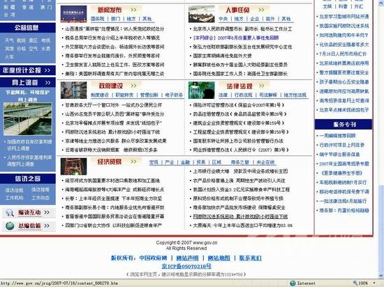 中國政府網(wǎng)版面設(shè)計(jì)的總體看與其他政府網(wǎng)站基本相似。從目前設(shè)置的"今日中國、中國概況、國家機(jī)構(gòu)、政府機(jī)構(gòu)、法律法規(guī)、政務(wù)公開、工作動(dòng)態(tài)、政務(wù)互動(dòng)、政府建設(shè)、人事任免、新聞發(fā)布、網(wǎng)上服務(wù)"等欄目看,信息內(nèi)容資源已經(jīng)非常龐大,但首頁內(nèi)容太多,網(wǎng)站版面設(shè)計(jì)的層次感較差,基本就是信息內(nèi)容的堆砌。