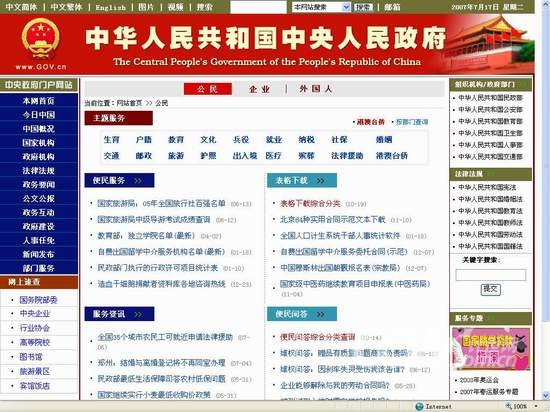 目前,中國政府網(wǎng)現(xiàn)開通了"今日中國、中國概況、國家機(jī)構(gòu)、政府機(jī)構(gòu)、法律法規(guī)、政務(wù)公開、工作動(dòng)態(tài)、政務(wù)互動(dòng)、政府建設(shè)、人事任免、新聞發(fā)布、網(wǎng)上服務(wù)"等欄目,面向社會(huì)提供政務(wù)信息和與政府業(yè)務(wù)相關(guān)的服務(wù),為政府與企業(yè)、公民的互動(dòng)交流搭建了一個(gè)現(xiàn)代化的平臺(tái)。