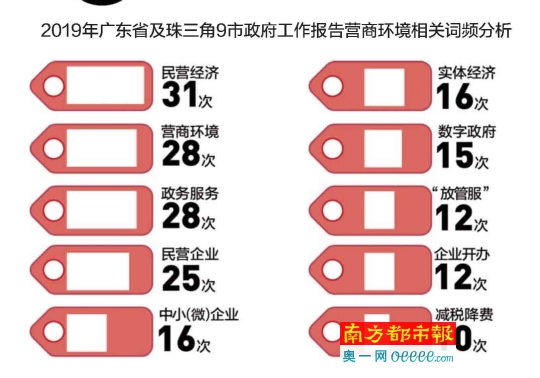 廣東省優(yōu)化營商環(huán)境改革將如何部署?記者從2019廣東省政府工作報告及珠三角9市政府工作報告中找答案。10份政府工作報告合計17.6萬多字,記者提取了與營商環(huán)境相關(guān)內(nèi)容近17000字,占總篇幅接近10%,并進行了分析。分析發(fā)現(xiàn)各地對優(yōu)化營商環(huán)境都做了相關(guān)部署,可見對營商環(huán)境的重視,深圳更定下明確目標:力爭達到相當于世界銀行發(fā)布的全球經(jīng)濟體營商環(huán)境排名前30名的水平。