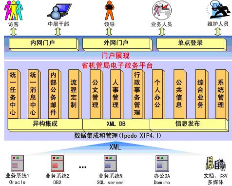 省機管局整合型電子政務(wù)平臺建設(shè)總體目標為:建設(shè)一個標準、合理、安全、開放、可擴展的基于“任務(wù)導(dǎo)向、應(yīng)用共享”的整合型電子政務(wù)平臺,提供統(tǒng)一的一站登陸、任務(wù)中心、消息中心、資源調(diào)度、網(wǎng)站管理、系統(tǒng)配置、應(yīng)用接口等各種功能模塊,為政務(wù)活動協(xié)同工作提供先進的交流手段(即時通信、提醒,文件共享、更新,資料推送、同步,項目管理、跟蹤等等)。