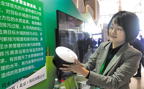工作人員正在介紹公司生產(chǎn)的河湖水質(zhì)監(jiān)測系統(tǒng)