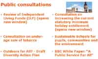 英國(guó)政府網(wǎng)站的公眾參與主要通過(guò)“公共咨詢(xún)”來(lái)實(shí)現(xiàn),如圖3所示。在網(wǎng)站組織形式上,它分為信息資源目錄導(dǎo)航區(qū),公眾咨詢(xún)主題目錄展示區(qū),幫助提示區(qū)??傮w來(lái)說(shuō),該欄目的設(shè)計(jì)有如下特點(diǎn):