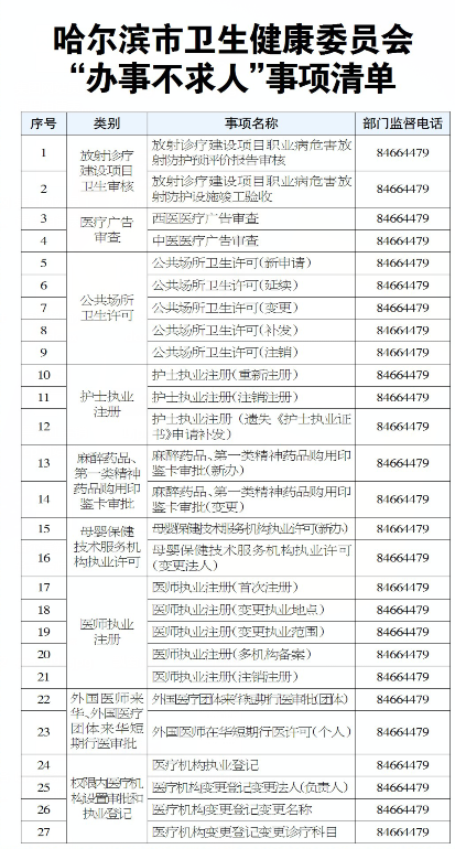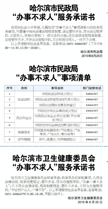 為貫徹落實(shí)省政府工作報(bào)告提出的“辦事不求人”要求,切實(shí)解決群眾、市場主體在日常生活和生產(chǎn)經(jīng)營中遇到的辦事求人問題。哈爾濱市市場監(jiān)督管理局、哈爾濱市民政局、哈爾濱市衛(wèi)生健康委員會(huì)、哈爾濱市人力資源和社會(huì)保障局、哈爾濱市住房和城鄉(xiāng)建設(shè)局、哈爾濱住房公積金管理中心6家單位梳理了第二批市級(jí)“辦事不求人”事項(xiàng)清單共計(jì)100項(xiàng),現(xiàn)予以公布。“辦事不求人”事項(xiàng)清單實(shí)行動(dòng)態(tài)管理,根據(jù)法律、法規(guī)、規(guī)章等辦事依據(jù)變化情況,及時(shí)對(duì)事項(xiàng)進(jìn)行調(diào)整和完善?!稗k事不求人”事項(xiàng)清單將分批次對(duì)外公布,最終實(shí)現(xiàn)全覆蓋。清單中所列事項(xiàng)辦事指南可在哈爾濱政務(wù)服務(wù)網(wǎng)(http://zwfw.harbin.gov.cn),部門網(wǎng)站及各單位對(duì)外辦事窗口進(jìn)行查詢。歡迎社會(huì)各界對(duì)“辦事不求人”工作建言獻(xiàn)策,各單位將自覺主動(dòng)接受監(jiān)督,對(duì)違諾失信行為將嚴(yán)肅追究相關(guān)人員責(zé)任。全市統(tǒng)一監(jiān)督投訴電話:0451-12388。