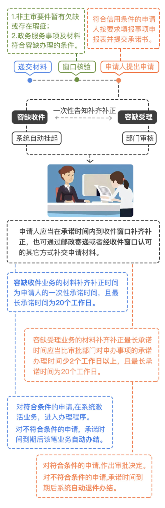 “容缺辦理”包括容缺收件和容缺受理,是辦事時的非主審要件暫有欠缺或存在瑕疵,窗口可先予收件或?qū)徟块T先予受理的政務(wù)服務(wù)活動。容缺受理后業(yè)務(wù)進入審批流程,并開始計時,在收到申請人補齊補正的材料后正式出證。補齊補正承諾時限須比事項的承諾辦理時間少2個工作日以上,且最長不超過20個工作日。
