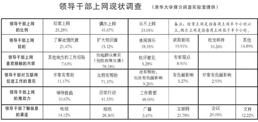 近日,清華大學(xué)媒介調(diào)查實驗室的一次調(diào)查問卷顯示,在629名地方黨政縣處級以上領(lǐng)導(dǎo)中,25.28%的干部經(jīng)常上網(wǎng),41.67%的干部偶爾上網(wǎng)。近70%的干部有“觸網(wǎng)”的經(jīng)歷。