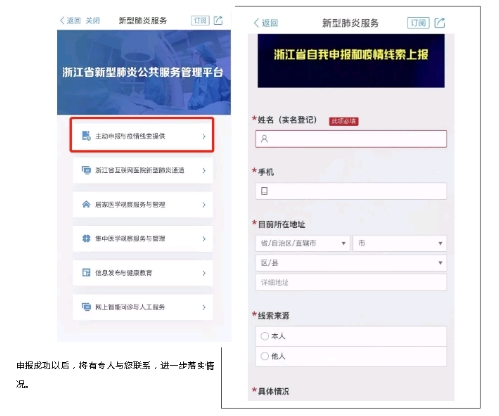 1、主動(dòng)申報(bào)與疫情線索提供:自己或身邊有疑似癥狀(發(fā)燒、胸悶、咳嗽、乏力、腹瀉等)、曾接觸過發(fā)熱或者呼吸道癥狀患者、自2020年1月1日起在湖北省停留過、自2020年1月1日起接觸過來自湖北的人、在湖北長期工作學(xué)習(xí)或生活、自2020年1月1日起吃過野味或接觸過野味市場等等,有此情況的都可以在手機(jī)上自我申報(bào)。申報(bào)成功以后,將有專人與您聯(lián)系,進(jìn)一步落實(shí)情況。