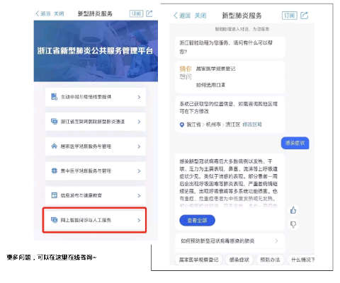 3、網(wǎng)上智能問診與人工服務(wù):如何選用口罩?什么情況下需要就醫(yī)?浙江省定點(diǎn)醫(yī)院都有哪些?你可以在這里通過智能問診得到權(quán)威解答。