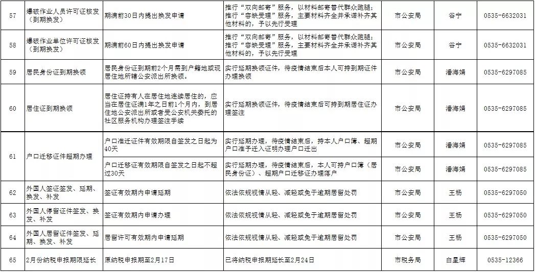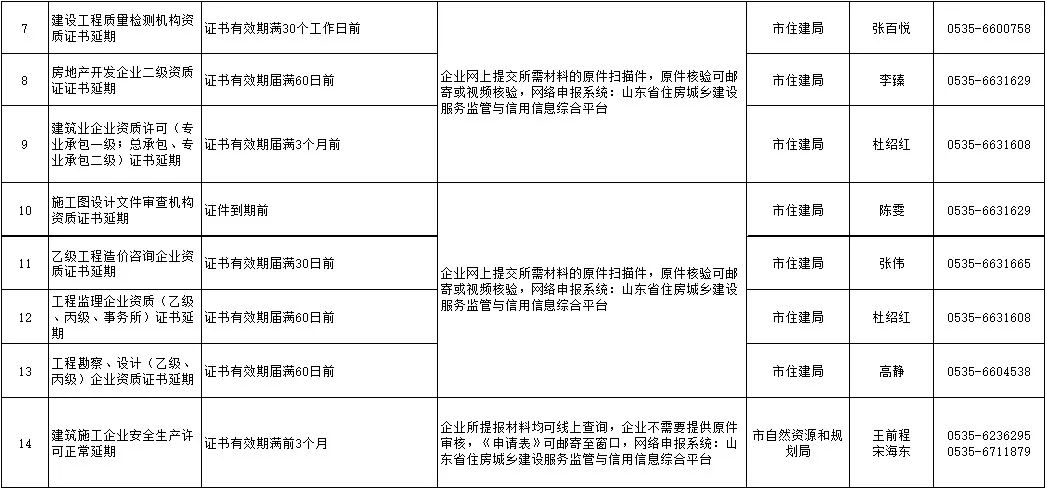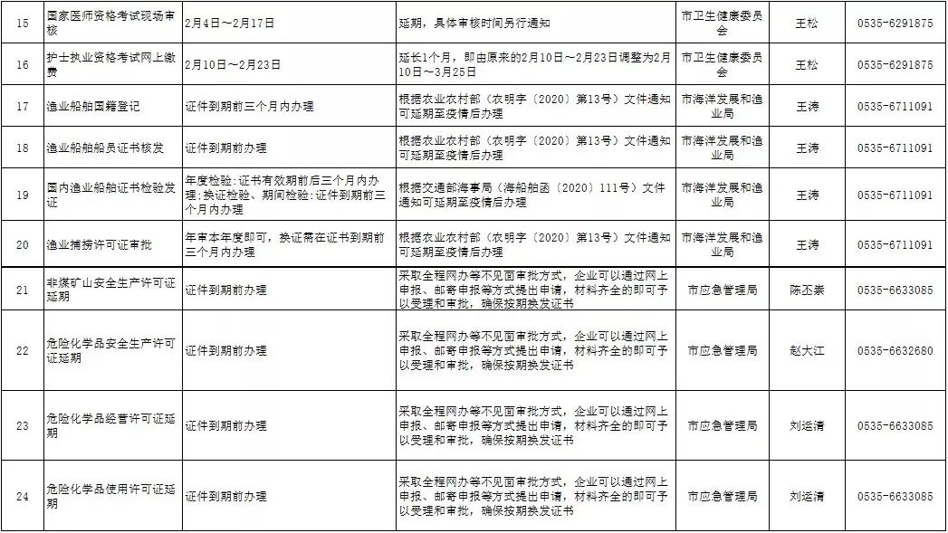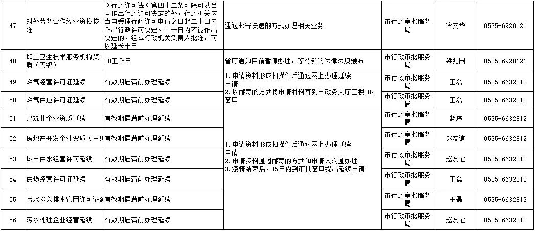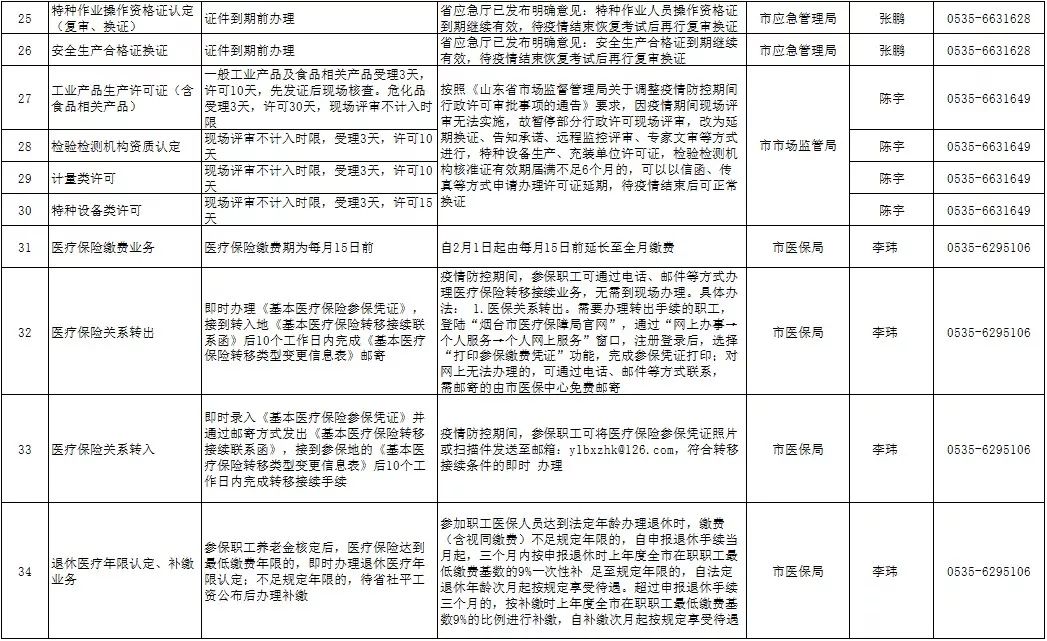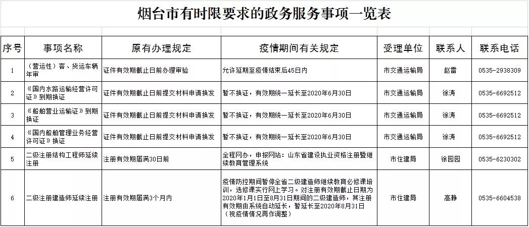 為保障疫情防控和政務(wù)服務(wù)兩不誤,煙臺市政務(wù)服務(wù)管理辦公室梳理出三大類65項有時限要求的政務(wù)服務(wù)事項。其中有56項可網(wǎng)上辦、延期辦,具體包括:建設(shè)工程質(zhì)量檢測機構(gòu)資質(zhì)證書延期、施工圖設(shè)計文件審查機構(gòu)資質(zhì)證書延期等30項,(營運性)客、貨運車輛年審、居民身份證到期換領(lǐng)等26項。另有,檢驗檢測機構(gòu)資質(zhì)認定等9個事項暫停受理,將根據(jù)疫情防控形勢,由國家、省相關(guān)行政主管部門確定具體恢復時間。詳細情況公布如下: