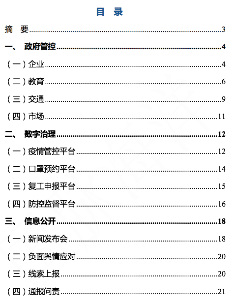 摘要:新冠肺炎疫情發(fā)生以來,浙江各級政府和人民全力以赴抗擊疫情。全省動員、全面部署、快速反應(yīng),采取了最全面、最嚴(yán)格的防控舉措,打響了一場疫情防控的人民戰(zhàn)爭。本報(bào)告采集浙江省本級和11個(gè)地級市的疫情防控相關(guān)數(shù)據(jù),從政府管控、數(shù)字治理、信息公開三個(gè)維度進(jìn)行數(shù)據(jù)采集、分析,總體來看浙江省各級政府在企業(yè)、教育、交通、市場等領(lǐng)域均開展了相關(guān)防疫工作措施,通過全省政務(wù)服務(wù)平臺渠道快速搭建了相關(guān)疫情服務(wù)平臺,提供疫情信息發(fā)布、疫情線索申報(bào)、醫(yī)療服務(wù)、同行程人員查詢、口罩預(yù)約等服務(wù),同時(shí)各級政府也通過新聞發(fā)布會等形式及時(shí)公布疫情信息,辟謠并查處違法行為等。
