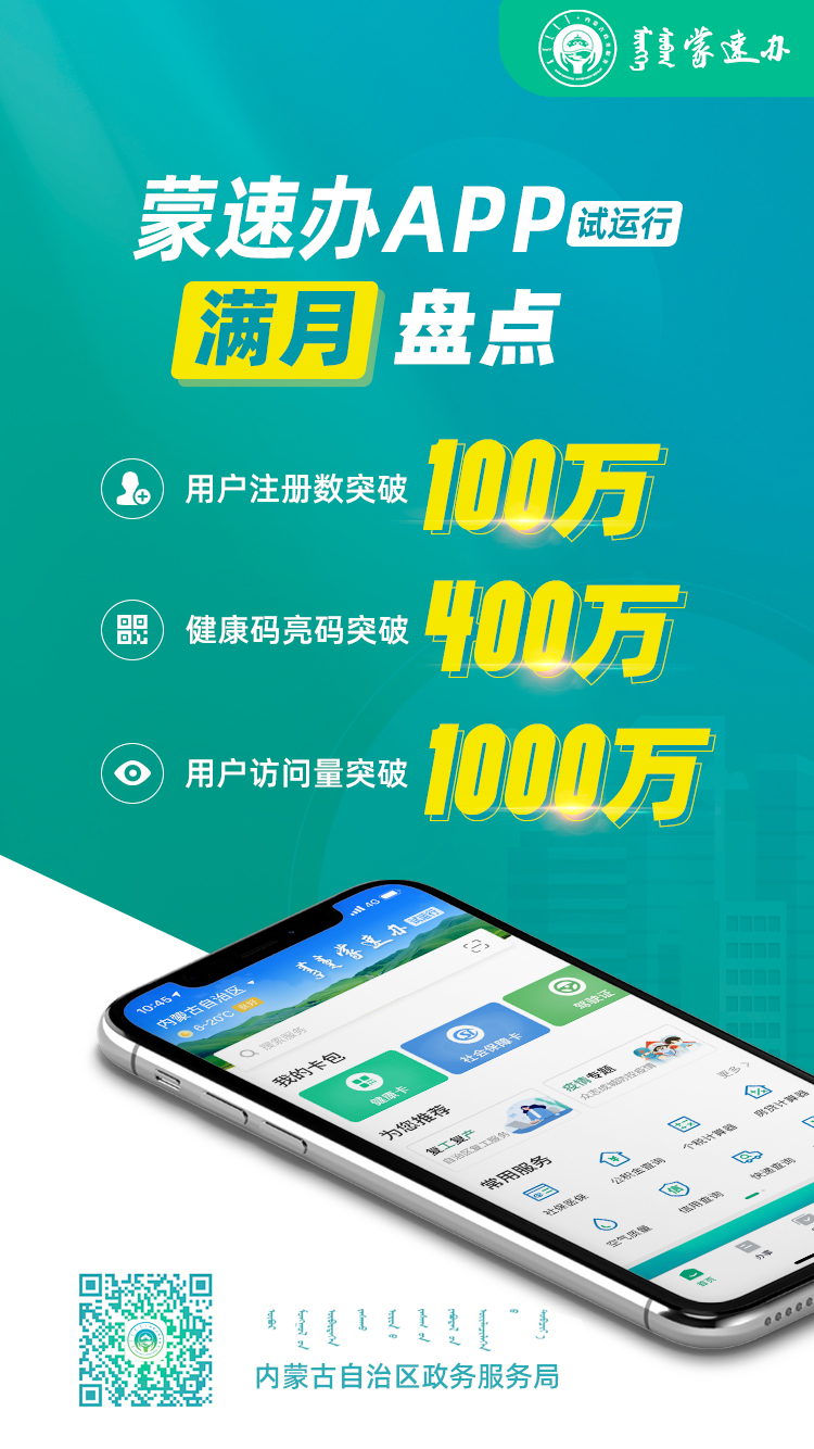 4月14日,“蒙速辦”APP在試運(yùn)行滿月之際,實(shí)現(xiàn)注冊用戶突破100萬,累計(jì)訪問量超過1000萬次?!懊伤俎k”是內(nèi)蒙古自治區(qū)政務(wù)服務(wù)局負(fù)責(zé)建設(shè)的全區(qū)一體化在線政務(wù)服務(wù)移動端,為全力打造政務(wù)服務(wù)“掌上辦”“指尖辦”邁出堅(jiān)實(shí)的第一步。