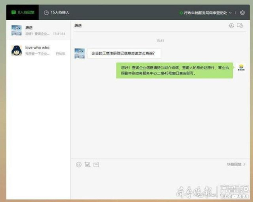 近日,記者在煙臺開發(fā)區(qū)政務(wù)服務(wù)中心看到,行政審批服務(wù)局商事登記處窗口工作人員劉少霞正在通過窗口“云客服”系統(tǒng),為辦事群眾解答企業(yè)設(shè)立登記方面的業(yè)務(wù)咨詢。兩人一問一答,實(shí)時溝通交流,利用方寸鍵盤就為群眾辦事消除了疑惑,解決了問題。