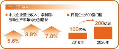 國(guó)企規(guī)模實(shí)力持續(xù)增強(qiáng),效益穩(wěn)步提高。預(yù)計(jì)到今年底,中央企業(yè)資產(chǎn)總額將接近69萬(wàn)億元,比“十二五”末增長(zhǎng)45%。“十三五”以來(lái),中央企業(yè)營(yíng)業(yè)收入、凈利潤(rùn)、勞動(dòng)生產(chǎn)率年均分別增長(zhǎng)5.6%、8.9%、7.8%,進(jìn)入世界500強(qiáng)的中央企業(yè)達(dá)到48家。民企改革發(fā)展成效顯著?!笆濉币詠?lái),民營(yíng)企業(yè)500強(qiáng)門檻從2016年的100億元提升至2020年的200億元;創(chuàng)新創(chuàng)業(yè)創(chuàng)造熱情高漲,中小企業(yè)數(shù)量增長(zhǎng)近1倍。