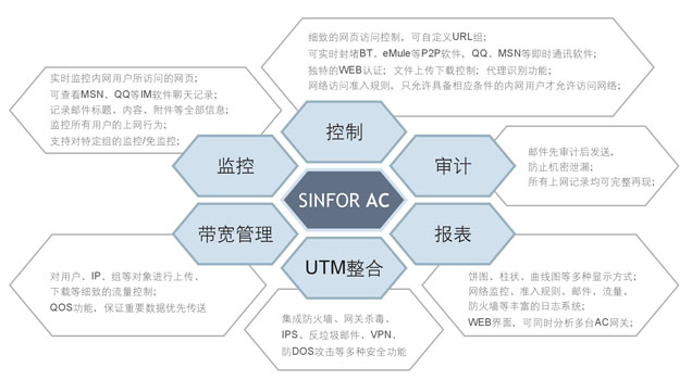作為一個UTM整合式設(shè)備,SINFOR AC上網(wǎng)行為管理設(shè)備還集成了:防火墻、網(wǎng)關(guān)殺毒、IPS、VPN、反垃圾郵件等多種安全功能。SINFOR AC上網(wǎng)行為設(shè)備從內(nèi)到外、全方位一體化,保護企業(yè)網(wǎng)絡的整體安全。SINFOR AC上網(wǎng)行為管理設(shè)備,能夠幫助您的企業(yè):提高員工工作效率、降低企業(yè)泄密風險、減少企業(yè)法律責任、保護企業(yè)內(nèi)外網(wǎng)絡整體安全。