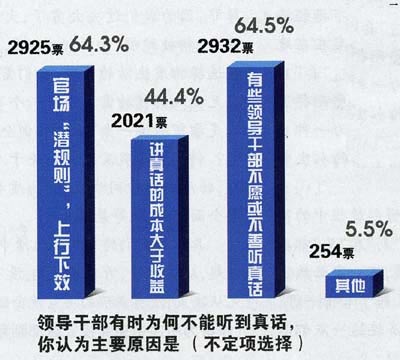 對于“領(lǐng)導(dǎo)干部有時不能聽到真話的主要原因”的不定項選擇,64.5%的受調(diào)查者認(rèn)為是由于 “有些領(lǐng)導(dǎo)干部不愿或不善聽真話”(2932票);64.3%的受調(diào)查者選擇“官場‘潛規(guī)則’,上行下效”(2925票),兩個選項得票不相上下,值得深思。另外,有44.4%的受調(diào)查者認(rèn)為原因在于“講真話的成本大于收益”(2021票)。