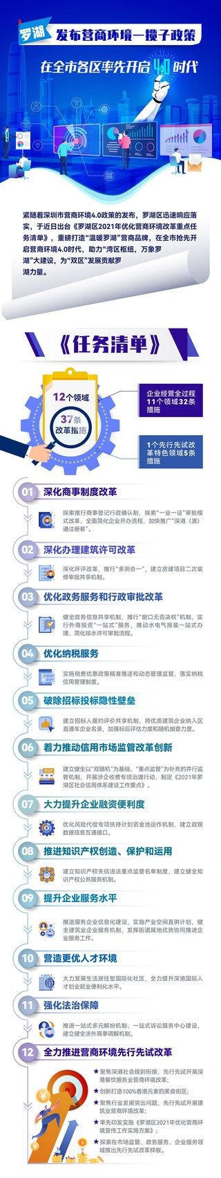 日前,深圳發(fā)布營(yíng)商環(huán)境4.0改革政策,羅湖區(qū)迅速響應(yīng)落實(shí),出臺(tái)《任務(wù)清單》,為“雙區(qū)”發(fā)展貢獻(xiàn)羅湖力量。