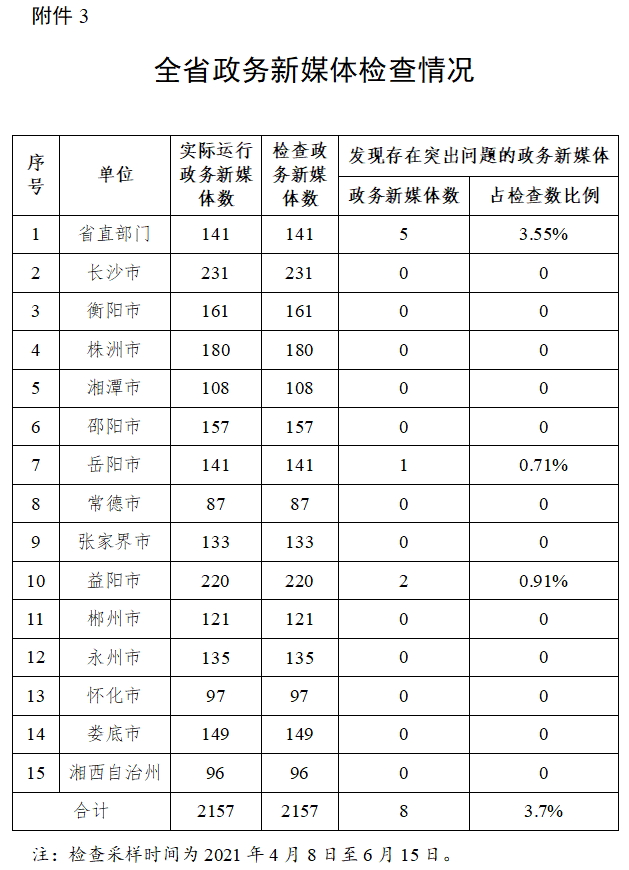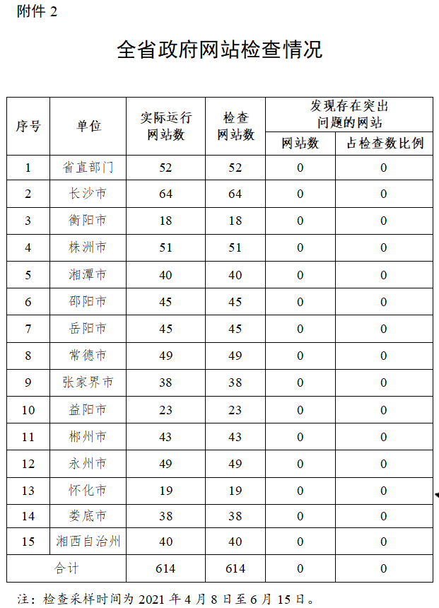 2021年第二季度,省政務(wù)局組織對全省正常運(yùn)行的614家政府網(wǎng)站進(jìn)行全覆蓋檢查,無存在突出問題政府網(wǎng)站,總體檢查合格率100%。重點(diǎn)檢查了50家省直單位網(wǎng)站互動交流功能,其中省長信箱欄目有32家單位、部門直通車欄目有20家單位實(shí)現(xiàn)了對簡單常見咨詢問題1個(gè)工作日內(nèi)準(zhǔn)確答復(fù)(詳見附表1)。對全省正常運(yùn)行的2157家政務(wù)新媒體進(jìn)行普查,發(fā)現(xiàn)8家存在單項(xiàng)否決問題,總體合格率99.63%,其中長沙市、衡陽市、株洲市、湘潭市、邵陽市、常德市、張家界市、郴州市、永州市、懷化市、婁底市、湘西自治州政務(wù)新媒體檢查合格率100%。